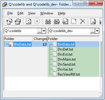 Eine mögliche Anwendung ist der Vergleich von Quelltexten, die aus unterschiedlichen Applikationsversionen stammen. Im obigen Screenshot sind zwei Versionen der Datenbank „CodeLibrary“ eingetragen, der Release- und der Entwicklungsstand. Ein „Comparison Tool“ kann den Inhalt beider Verzeichnisse vergleichen und die Unterschiede anzeigen. Auf diese Weise können die durchgeführten Quelltextänderungen von einer weiteren Person, beispielsweise im Rahmen der Qualitätssicherung, überprüft werden. Der folgende Screenshot zeigt die Unterschiede zwischen beiden Versionen der „CodeLibrary“.