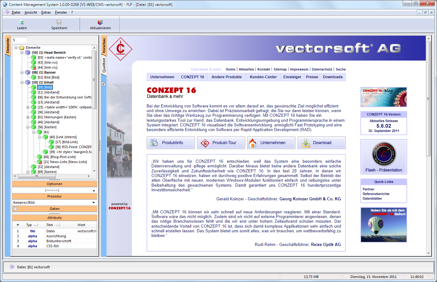 Angefangen haben wir mit der Umsetzung unseres Internetauftritts test.vectorsoft.de auf unser neues CMS. Nachdem wir einige Erfahrung gesammelt hatten, haben wir auch weitere Projekte mit dem CMS umgesetzt. Die Inhalte der Web-Administration des CONZEPT 16-Servers werden ebenfalls über das CMS generiert.