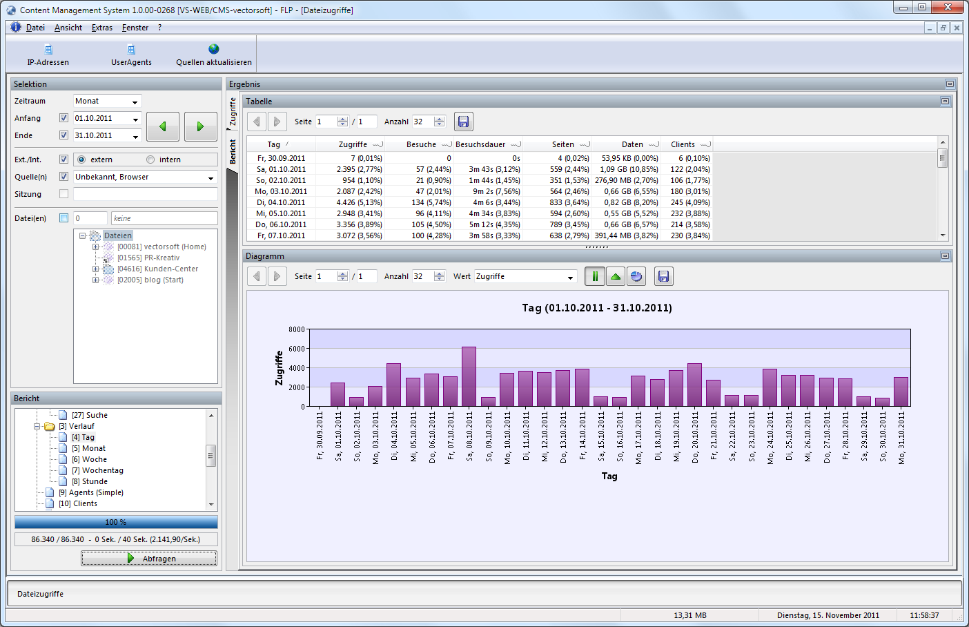 Außerdem verfügt das CMS über ein System zur Auswertung der Zugriffe über den Web-Server. Damit lassen sich detaillierte Berichte über die Zugriffe erzeugen und visualisieren. Dies kann zum Beispiel ein Bericht über die monatlichen Besuchszahlen sein. Die Berichte können vom Anwender selbst angepasst und erweitert werden.
