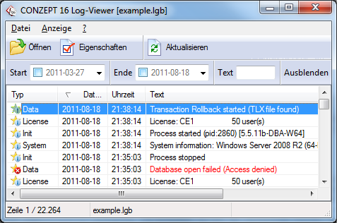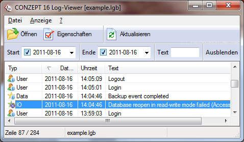 Da uns der Kunde ein Datum mit einem Zeitraum in dem der Fehler aufgetreten ist genannt hat können wir die Anzeige der Log-Einträge schon einmal auf diesen Zeitraum begrenzen. Dafür öffnen wir den Filter (Strg+F) und geben als Start- und Enddatum den 16.08.11 an. Schon schrumpft die Anzahl der Einträge auf knapp 300.