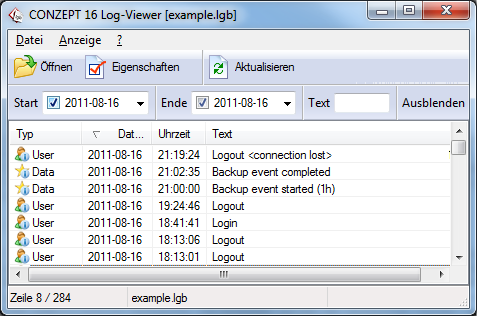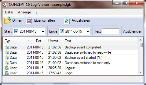 Mit den Parametern -start= und -end= können Sie den Zeitraum vom Export eingrenzen. Über den Parameter -filterex können Sie die unterschiedlichen Eintragstypen und -Klassen herausfiltern. Nähere Informationen erhalten Sie in der Dokumentation bzw. mit dem Befehl "c16_serv_cmd_win.exe help decode"