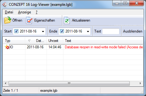 Übrig bleibt ein Eintrag, die gesuchte Fehlermeldung: „Database reopen in read-write failed (Acces denied)“. Dieser Eintrag verrät uns nicht nur welcher Fehler aufgetreten ist, sondern auch den genauen Zeitpunkt.