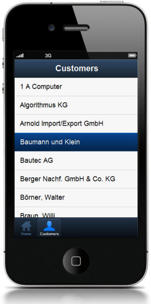Die Daten der dargestellten Kunden und Ansprechpartner werden über das Internet von einem Webservice abgeholt (soatest.conzept16.de). Der Webservice basiert auf dem CONZEPT 16 SOA-Service und gibt die Informationen im JSON-Format an die App zurück.