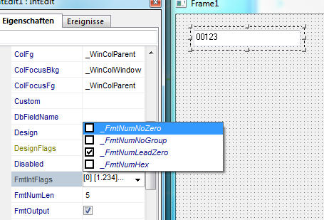 Einige Oberflächen-Objekte unterstützen auch die Möglichkeit der Ausgabe-Formatierung. Beim IntEdit-Objekt geschieht dies z.B. über die Eigenschaft wpFmtIntFlags
