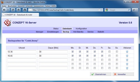 In der Web-Administration wird auf der Seite „Datenbank“ / „Manager“ eine Datenbank ausgewählt. Anschließend können auf der Seite „Datenbank“ / „Backup“ die Backup-Zeiten definiert werden. Es sind mehrere Sicherungszeiten möglich. Die Web-Administration kann beispielsweise über das Control-Center auf dem Server gestartet werden. Die Eintragungen könnten wie folgt aussehen: