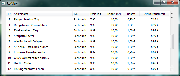befinden sich die Spalten Artikel-ID, Artikelname, Artikeltyp, der Verkaufspreis und der Rabattprozentsatz . Diese Daten werden direkt aus der Datenbank in das RecView-Objekt