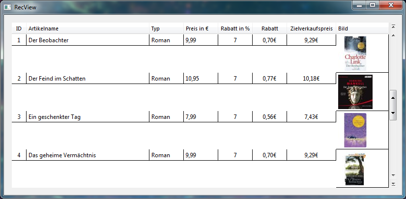 Das RecView-Objekt eignet sich für die Darstellung von Inhalten aus der Datenbank mit variabler Zeilenhöhe. Es ist Beispielsweise die Anzeige von RTF-Inhalten, Texten und Bildern möglich.