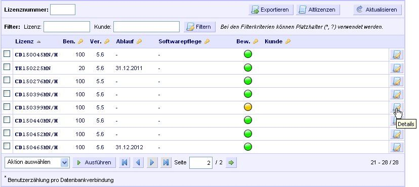 In der Übersicht der Lizenzen wird mittels eines Klicks auf den Button Details eine Seite geladen, die detaillierte Informationen zu einer Lizenz zur Verfügung stellt.