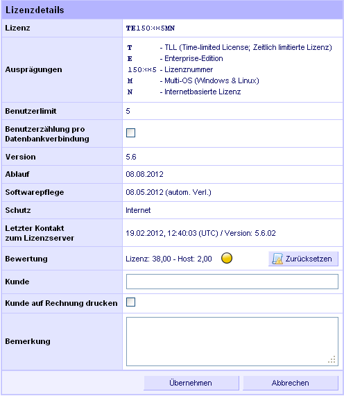 - KundeIn diesem Feld kann der Anwender, bei dem die Lizenz eingesetzt wird, hinterlegt werden