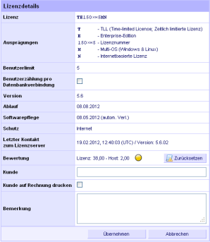 - BewertungAusgabe der Lizenz- und Host-Bewertung. Zusätzlich wird der Button „Zurücksetzen“ angezeigt, wenn die Lizenzbewertung „gelb“ oder „rot“ ist und der angemeldete Benutzer über die Berechtigung zur Eingabe eines Notfallcodes verfügt