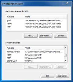 Auf welches Verzeichnis die Variablem gesetzt sind, kann über den Aufruf von Systemeigenschaften -> Umgebungsvariablen überprüft werden. Dabei ist zu beachten, dass die Variablen unter „Benutzervariablen“ als auch unter „Systemvariablen“ definiert sind.