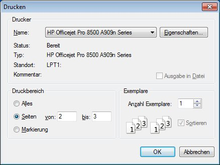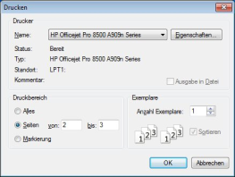 In diesem Dialog hat der Anwender die Möglichkeit, bestimmte Einstellungen für die anschließende Druckausgabe vorzunehmen. Zu den Einstellungen zählen zum Beispiel der Bereich der zu druckenden Seiten oder die Anzahl der Kopien.