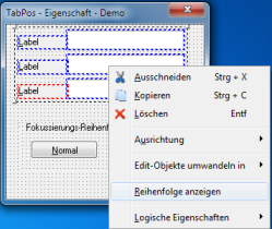 Generell ist die Reihenfolge des Tabulators direkt mit der Reihenfolge der Erstellung gekoppelt. Das bedeutet, dass ein Objekt, welches vor einem anderen Objekt erstellt wurde, in der Tabulator-Reihenfolge vor diesem angesiedelt ist. Dies kann jederzeit innerhalb des Designers geändert werden. Hierzu werden die betroffenen Objekte markiert, anschließend erscheint im Kontextmenü der Eintrag ‚Reihenfolge anzeigen‘.