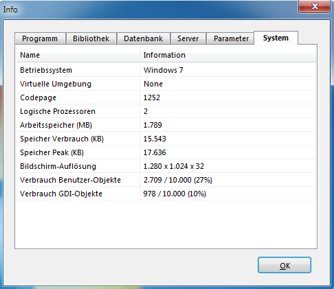 • In CONZEPT 16Auf der Seite „System“ des „Info-Dialogs“ lässt sich der Verbrauch an Benutzer- und GDI-Objekten ablesen. Dieser Dialog lässt sich über die Funktion WinOpen(_WinC16Info) auch in die eigene Anwendung integrieren.