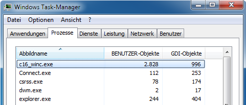 • Unter WindowsÜber den Task-Manager lässt sich der Verbrauch an Benutzer- und GDI-Objeken ermitteln. Standardmäßig werden die Spalten nicht angezeigt und müssen nachträglich auf sichtbar gestellt werden.