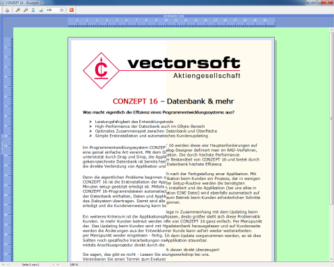 Die CONZEPT 16-Druckobjekte sind abgesehen vom PrtRtf-Objekt bereits WYSIWYG-fähig. Dies bedeutet, dass die Ausgabe in der Druckvorschau und auf dem Drucker identisch ist.