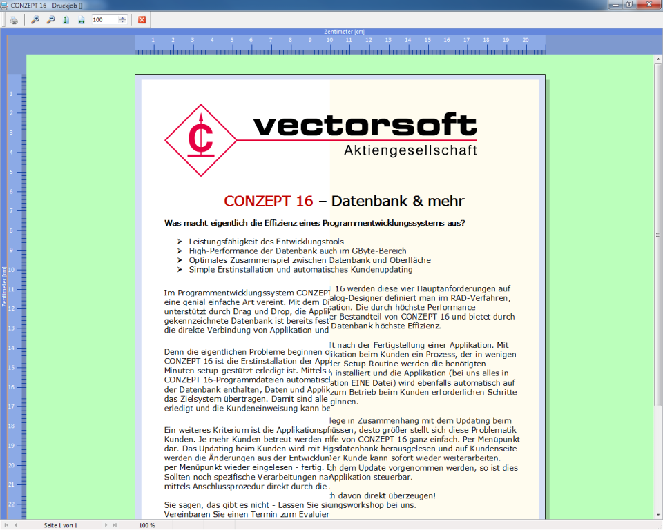 Das PrtText-Objekt stellt diese WYSIWYG-Funktionalität zur Verfügung, weil CONZEPT 16 hier die Berechnung der Text-Formatierung und Darstellung durchführt (unabhängig vom Drucker!).