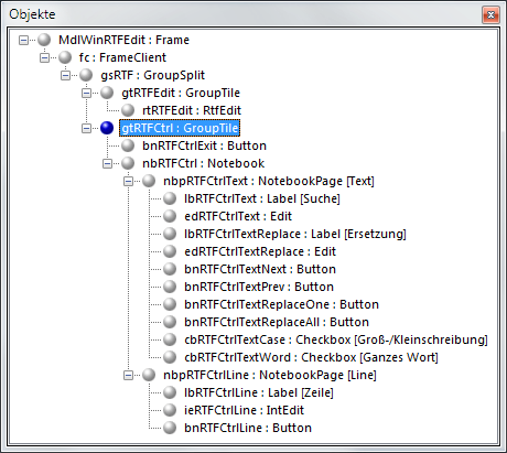 Zur Anbindung der Suchleiste müssen innerhalb des Fensters, in dem sich das RTFEdit-Objekt befindet, weitere Objekte angelegt werden: Die Suchleiste besteht aus einem GroupTile-Objekt, in dem alle Unterobjekte der Suchleiste, wie Schaltflächen und Eingabefelder, enthalten sind:
