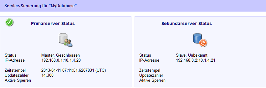 Im obigen Bild ist zu erkennen, dass die Datenbank auf dem Primärserver den Status „Master“ besitzt. Dabei handelt es sich um diejenige Datenbank, an der sich die Benutzer anmelden können. Die Datenbank des Sekundärservers besitzt den Status „Slave„. Da die Datenbank zu diesem Zeitpunkt physikalisch noch nicht auf dem Sekundär-System vorhanden ist, wird zusätzlich der Hinweis „Unbekannt“ ausgegeben.