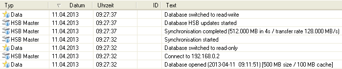 Die Anzeige in der Web-Administration gibt grundsätzlich den aktuellen Status wieder. Die Chronologie der Ereignisse wird in die Protokolldatei der Datenbank geschrieben. In dieser werden auch die Hot-Standby spezifischen Aktionen festgehalten. Zu den Schritten „Öffnen der Master-Datenbank“, „Synchronisation“ und „Hot-Standby-Betrieb“ existieren jeweils korrespondierende Einträge. Nachfolgend der Auszug aus der Protokolldatei der Master-Datenbank.