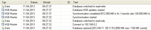 Alle Hot-Standby relevanten Aktionen werden in der Spalte „Typ“ mit dem Kürzel „HSB“ gekennzeichnet. Zusätzlich wird die Rolle der Datenbank angegeben. Im konkreten Fall „Master„, da es sich um das Protokoll der Master-Datenbank handelt.