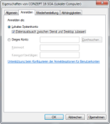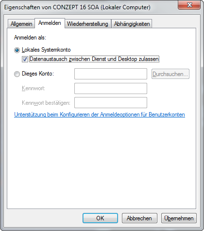 Über den Eintrag c16_proc_extended der Konfigurationsdatei kann im SOA-Service (32-Bit) die c16_objw.dll eingebunden und somit auf Oberflächenfunktionen zugegriffen werden. Standardmäßig kann der SOA-Service nicht mit der Oberfläche interagieren. Falls Dialoge angezeigt werden müssen, ist es daher notwendig in der Windows-Verwaltung der Dienste den Haken bei „Datenaustausch zwischen Dienst und Desktop zulassen“ zu setzen. Dies sollte jedoch nur gesetzt werden, wenn es zwingend erforderlich ist, Dialoge im SOA-Service anzuzeigen.