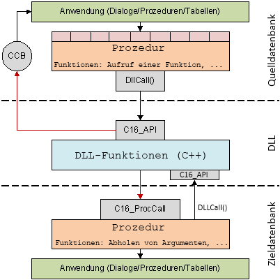 Die Vermittlungs-DLL wird von der Quelldatenbank (Applikation) per DllCall() angesprochen. Die DLL selbst ruft dann Prozeduren in der Zieldatenbank auf und benutzt dabei die Programmierschnittstelle C16_API (c16_pgxw.dll bzw. c16_pgxe.dll), in der alle dazu notwendigen Funktionen vorhanden sind. Die DLL ist in C++ geschrieben und besteht aus recht wenig Quelltext. Bei späteren Erweiterungen des Funktionsumfangs bleibt die DLL unverändert, die notwendigen Modifikationen betreffen nur die Prozeduren in der Quell- und Zieldatenbank. Außerdem soll die DLL auch den parallelen Zugriff auf mehrere Zieldatenbanken erlauben.