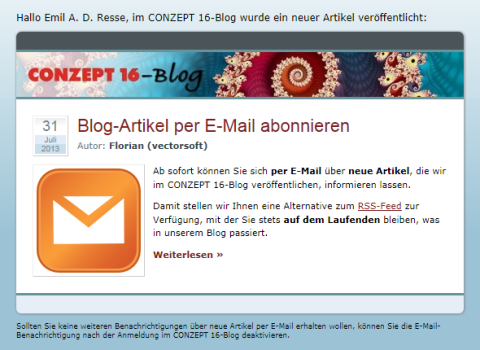 Ab sofort können Sie sich per E-Mail über neue Artikel, die wir im CONZEPT 16-Blog veröffentlichen, informieren lassen.