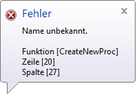 Tritt beim Kompilieren der Prozedur ein Fehler auf, erscheint eine kleine Fehlermeldung. Wird diese mit der Return-Taste bestätigt, wird in der Hilfe der Datenbankinfo die zugehörige Hilfeseite der Fehlermeldung geöffnet.
