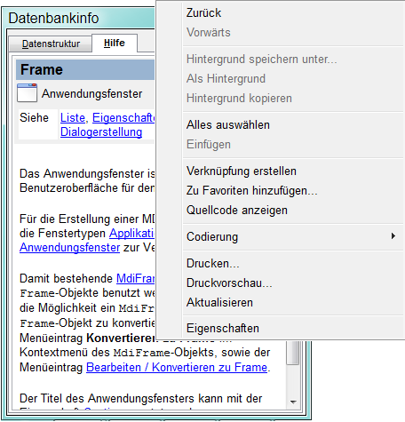 Durch das Auswählen eines Objektes im Designer, wird automatisch die entsprechende Hilfeseite zu diesem Objekt in der Datenbankinfo geladen. Ist nicht der Reiter Hilfe ausgewählt, sondern Datenstruktur, wird die Seite trotzdem geladen. Beim Wechseln in den Reiter Hilfe, wird die Seite entsprechend angezeigt.