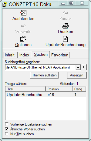 Die Dokumentation wird im Designer mit der F1-Taste gestartet. Ist diese bereits geöffnet, wird sie fokussiert und in den Vordergrund geholt. Diese Hilfe bietet neben der Anzeige der Hilfeseiten weitere Funktionalitäten. So kann über die Toolbar die Update-Beschreibungen der gesamten CONZEPT 16-Versionen eingesehen werden oder in den Optionen die Suchbegriffhervorhebung eingestellt werden. Aber auch das Suchen nach Informationen kann bequem geregelt werden.