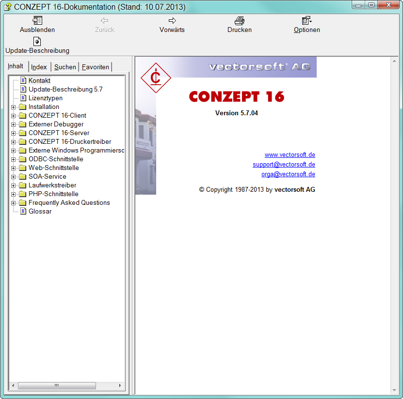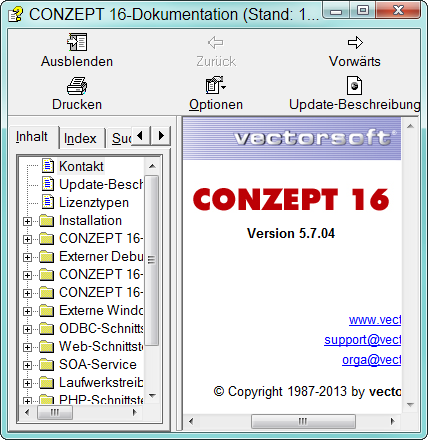 Die Dokumentation wird im Designer mit der F1-Taste gestartet. Ist diese bereits geöffnet, wird sie fokussiert und in den Vordergrund geholt. Diese Hilfe bietet neben der Anzeige der Hilfeseiten weitere Funktionalitäten. So kann über die Toolbar die Update-Beschreibungen der gesamten CONZEPT 16-Versionen eingesehen werden oder in den Optionen die Suchbegriffhervorhebung eingestellt werden. Aber auch das Suchen nach Informationen kann bequem geregelt werden.