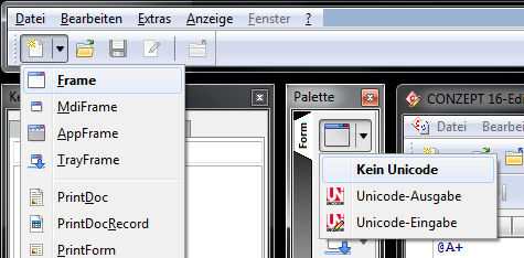 Die Toolbar des Designers wurde um einen Menübutton erweitert, mit dem die unterschiedlichen Form-Objekte und Menüs angelegt werden können. Desweiteren enthält die Palette im Reiter „Form“ nun ebenfalls Menübuttons, mit denen der Unicode-Modus der Objekte definiert werden kann.