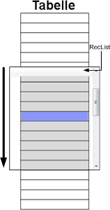 Das RecList-Objekt ist optimiert auf die Anzeige großer Tabellen. Daraus ergibt sich, dass es nicht möglich ist, alle vorhandenen Datensätze im Arbeitsspeicher zu halten. Aus diesem Grund hält die RecList jeweils nur die sichtbaren Sätze im Arbeitsspeicher vor (siehe Abb.1).
