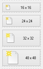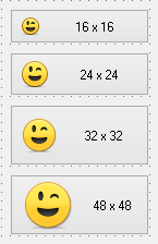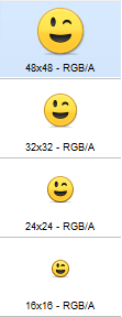 Hier bietet sich das – unter Windows – gebräuchliche Icon-Format (ICO) an. Dieses besitzt den Vorteil, dass es mehrere Repräsentationen ein und desselben Symbols, jedoch in unterschiedlichen Größen und Farbauflösungen enthalten kann (Abb. 2). Die Abbildung zeigt dies am Beispiel eines Smiley-Symbols, das in 4 Größen und als RGB mit Transparenz vorliegt.