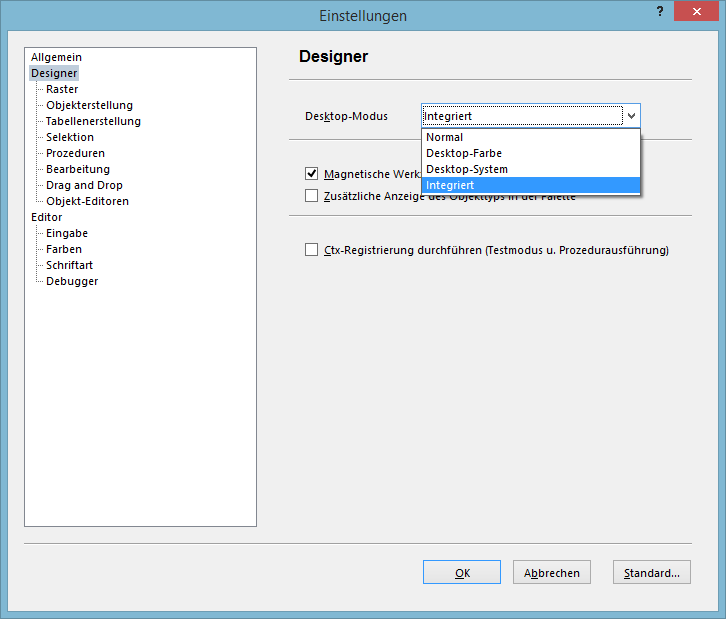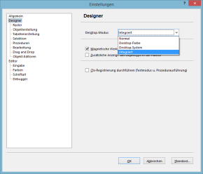 Möchten Sie die neue Darstellung verwenden, dann ist ein Blick in die Designer-Einstellungen notwendig (Abb. 3). Durch Auswahl des neuen Desktop-Modus ‚Integriert‘ und Bestätigung mit ‚OK‘ aktivieren Sie die neue Darstellung. Ein Neustart des Designers ist nicht notwendig. Ebenso einfach gelangen Sie auch wieder zurück zur ‚alten‘ Darstellung. Wählen Sie hierzu einfach den bisher verwendeten Desktop-Modus. Eine Umschaltung zwischen den Modi ist jederzeit ohne Einschränkungen möglich.