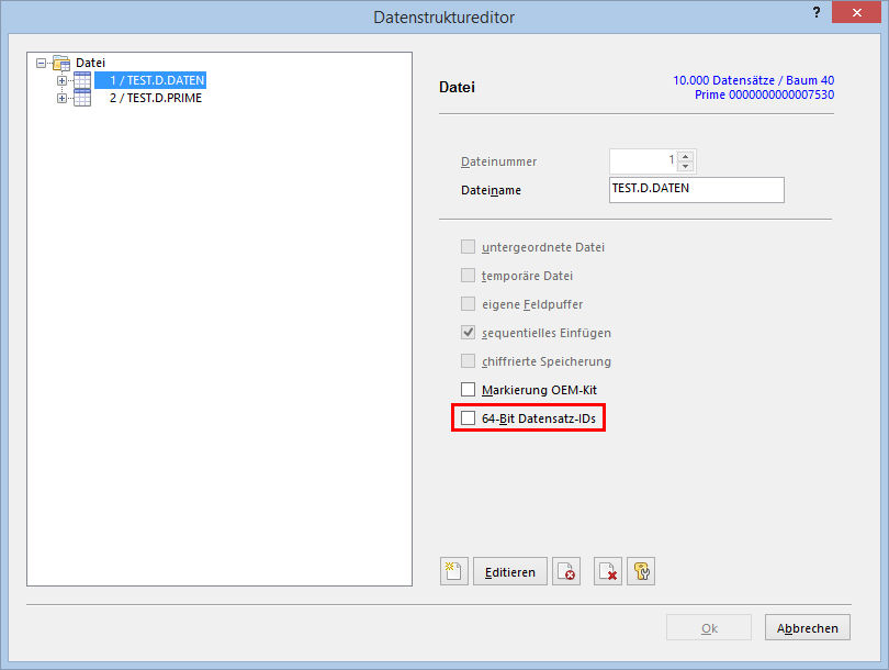 Für Dateien ohne sequentielles Einfügen sind 64-Bit Datensatz-IDs nicht möglich. Soll die Aktivierung dennoch erfolgen, muss die Option „sequentielles Einfügen“ aktiviert werden. Dies ist allerdings nur möglich, wenn die Datei leer ist.