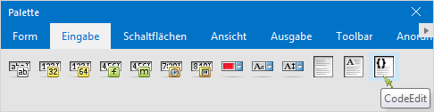 Der CodeEditor ist unter dem Reiter Eingabe als Paletten-Objekt verfügbar. In der geteilten Ansicht können sowohl gleiche als auch unterschiedliche Dokumente geöffnet werden. Eine eigene API stellt Befehle für die Ansteuerung zur Verfügung.