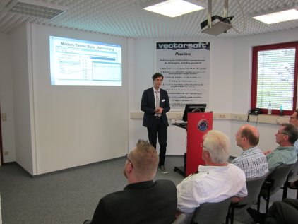 Nach der Mittagspause stellte Herr Sworowski den letzten Teil der "Modern Themes" inklusive der kommenden Umsetzung im Designer vor. Anschließend präsentierte Herr Cramer den neuen Editor und dessen Funktionalitäten. Danach gab vectorsoft Entwicklungsleiter Andrej Mücke einen Überblick über Eckpunkte zum Thema "CONZEPT 16 in der Cloud". Eine Unterhaltung über weiterführende Fragen und Anregungen rundete die informative Veranstaltung ab.